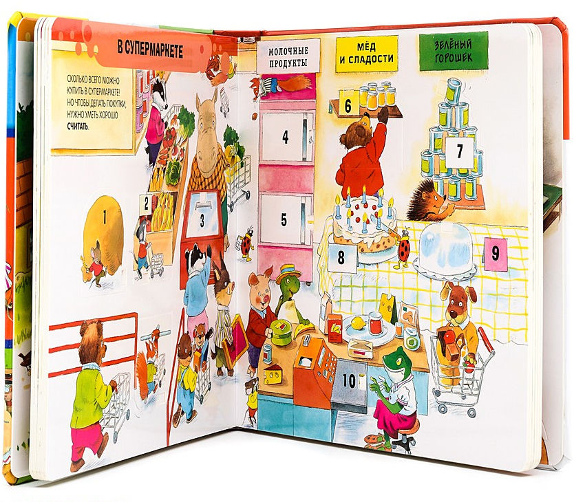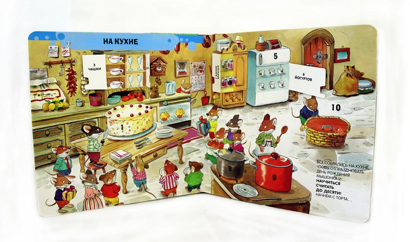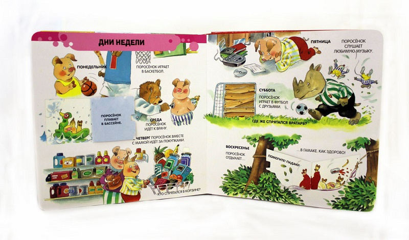 Открывая окошки, малыш познакомится с названиями дней недели и временами года, научится считать до 10 и определять разные формы и цвета, научится правильно употреблять глаголы и много-многое другое.