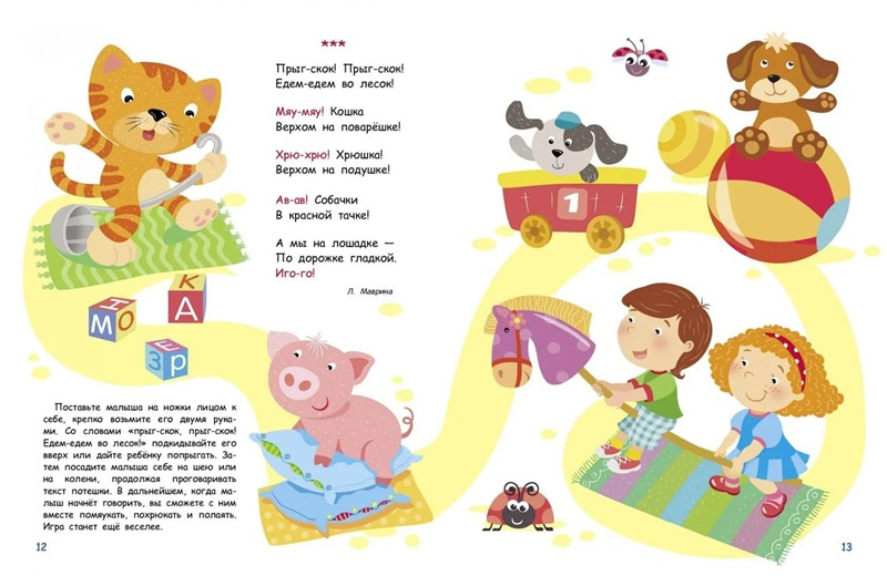 Со временем ребёнок запомнит движения и будет стараться принять в игре более активное участие. Постепенно он также запомнит отдельные слова и начнёт повторять их за вами. Когда малыш станет чуть старше, вы сможете с ним рассмотреть и обсудить картинки в этой книжке, а также выучить наизусть весёлые потешки. А теперь время играть!