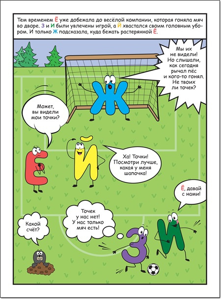 Захватывающий комикс про непоседливых точек, убежавших от буквы Ё, отлично подойдет как для тех, кто только начинает читать, так и для уже вполне уверенных в себе чтецов.