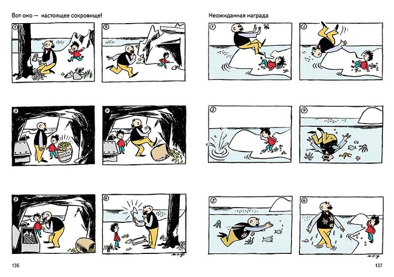 Между главными героями — особая связь двух родных по крови и по духу людей. И чтобы рассказать о ней, слова совсем не понадобились. Именно это так подкупает читателя и делает истории о папе и сыне настоящими маленькими шедеврами.