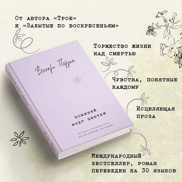 "Поменяй воду цветам" - это роман о чувствах, понятных каждому, и о торжестве жизни над смертью. Валери Перрен исцеляет душу читателя, проращивая в ней сад прекрасных цветов, освещенных солнечными лучами надежды.