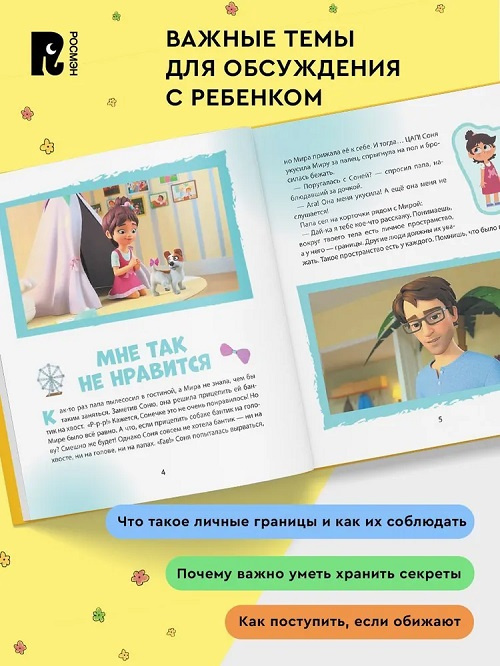 Придумала эти истории Наталья Ремиш, писательница, журналист, сценарист и продюсер проекта «Про Миру и Гошу». Сюжеты ее книги помогут родителям обсудить с ребенком затронутые в сказках темы, найти причины проблемы и вместе решить, как действовать в сложной ситуации в будущем.