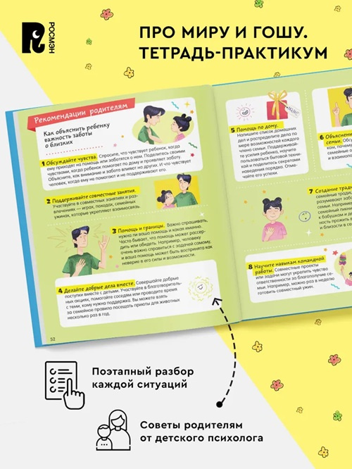 После каждой истории есть комментарии и советы родителям от психологов проекта про Миру и Гошу. Они помогут разобрать причины поднятых в сказках проблем, проговорить важные моменты и обсудить, как действовать в сложной ситуации в будущем. Закрепить новые знания на практике помогут веселые игры и задания.