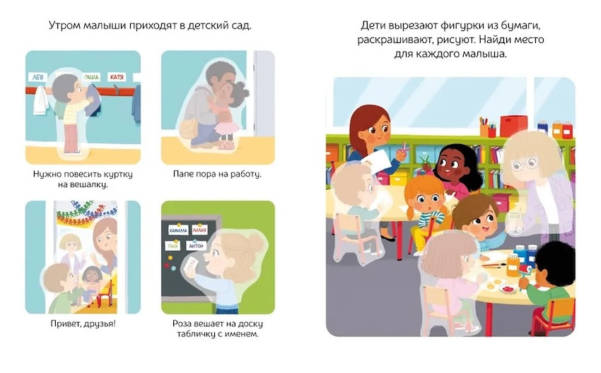 В детском саду столько всего интересного! Можно научиться читать, считать, рисовать, а также пообщаться с друзьями и поиграть в весёлые игры! Подбери подходящие наклейки и узнай, чем ещё занимаются малыши в детском саду.