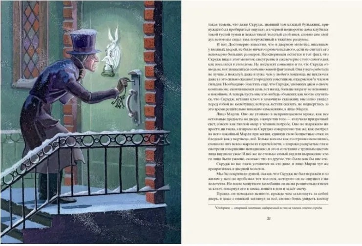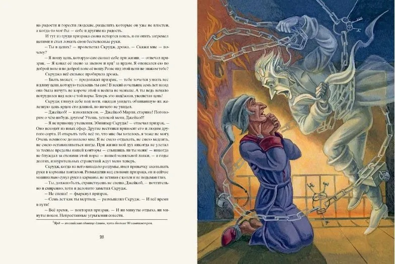 О таком неожиданном преображении человека хочется узнать все подробности. Такую возможность вместе с текстом Диккенса дают красочные иллюстрации художника Максима Митрофанова, который в своих рисунках постарался не упустить ни одного персонажа, ни одну важную деталь этой волшебной рождественской истории.