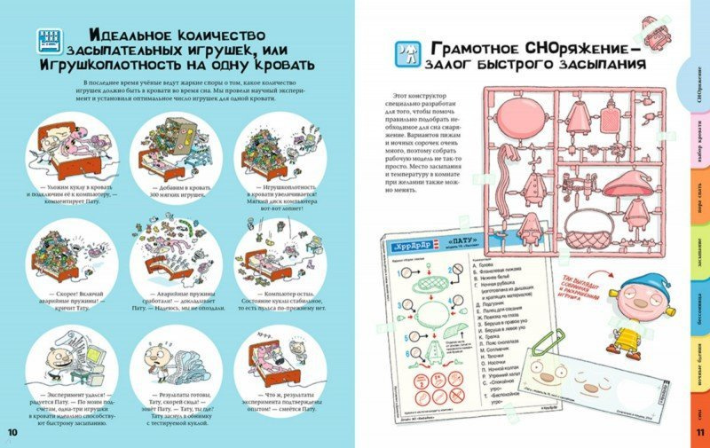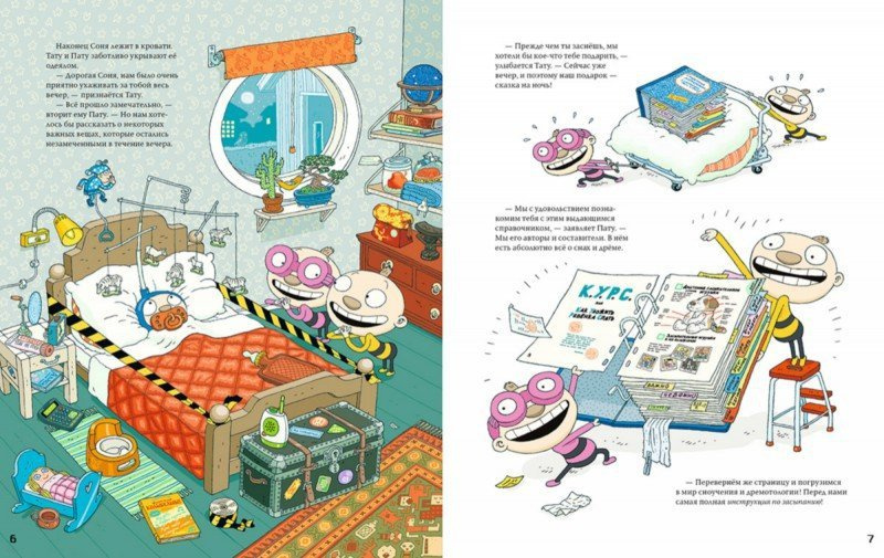 В гости к Тату и Пату приходит племянница Соня, и братья придумывают тысячу разных способов, как уложить малышку спать. Они даже составили специальный справочник: в нём рассказано, как выбрать идеальную игрушку для засыпания, что произойдёт, если долго не ложиться спать, почему родителям можно не спать до поздней ночи, а детям - нет, и многое другое.