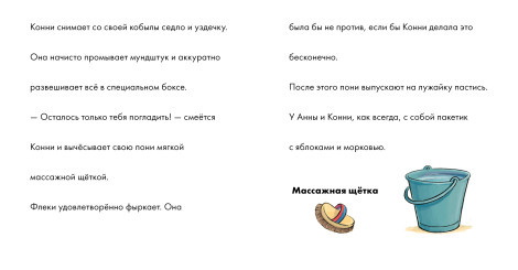 Конни и её любимица, пони Флеки, ― лучшие друзья с самого момента знакомства. Конни всегда тщательно вычёсывает её массажной щёткой, угощает вкусными яблоками и морковкой и навещает даже тогда, когда у них нет занятий. Но вдруг на конюшне появляется новая девочка, которая начинает ухаживать за любимицей Конни. Как же так? Флеки должна принадлежать только ей! Удастся ли Конни справиться с эмоциями и, возможно, найти нового друга? Присоединяйтесь к любимой героине, выполняйте увлекательные задания и узнайте много нового о лошадях.