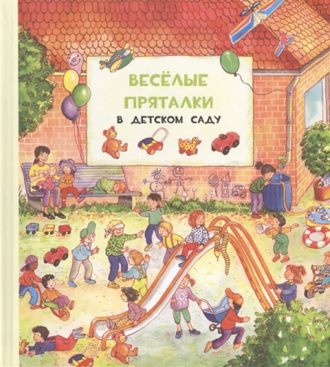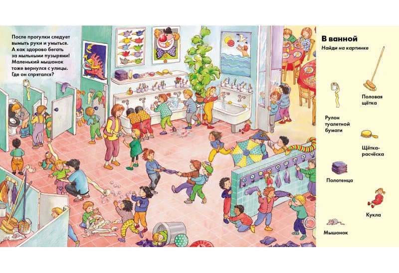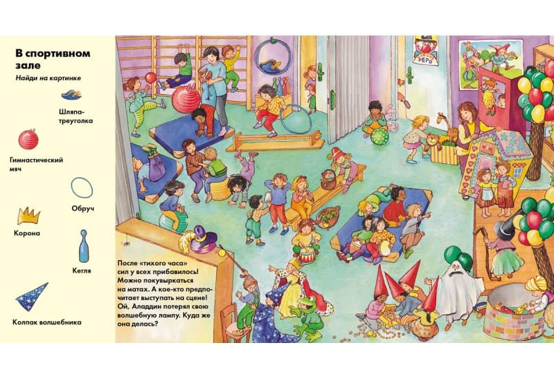Ты играешь в пряталки в детском саду? Ну конечно, в детском саду много чем можно заняться. Там есть и игровая комната, и спортивный зал, и площадка с горками! Но сегодня вместе с ребятами в детский сад пришёл и маленький мышонок. Он очень хитрый, его нелегко поймать! Рассмотри внимательно картинки. Ты нашёл мышонка?