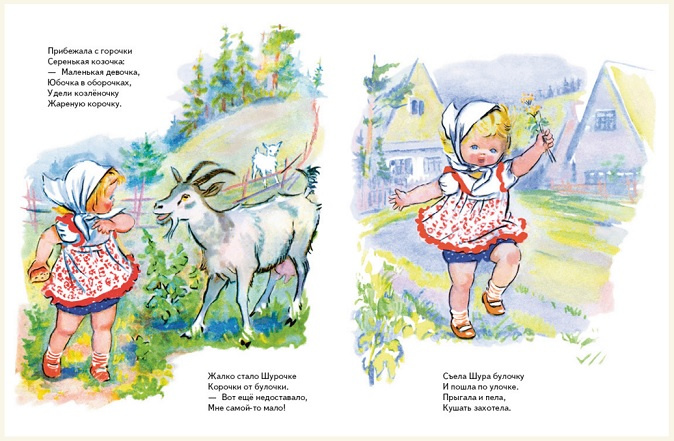 А тут, откуда ни возьмись, и курочка с цыплятками, и корова с телёнком, и коза с козлёнком - и все тоже хотят кусочек. Ох как жалко стало Шурочке вкусной-вкусной булочки!.. В этой простой истории - урок, понятный даже самым маленьким красным девицам и добрым молодцам.